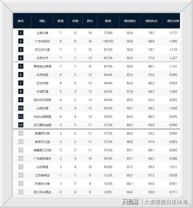 ②、8战全胜的广东男篮屈居第二;卫冕冠军广厦男篮7胜1负排名第3;
