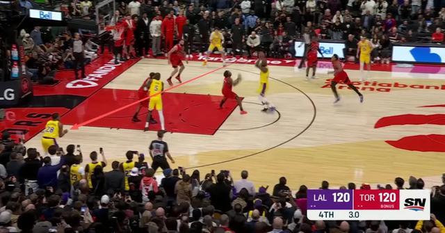 湖人对阵猛龙最后一攻,双方打平,里夫斯在边线被双人包夹,极限分球弧顶的詹姆斯,詹姆斯接球的时候时间只剩下4秒,防守八村塁的人过来补防詹姆斯,詹姆斯会怎么处理球?
