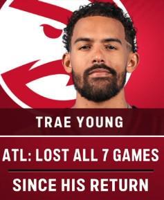 自特雷杨12月19日复出后,老鹰7战全败跌至东部第10