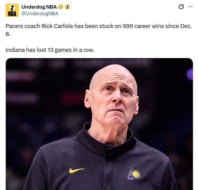 早在12月8日时,卡莱尔就已经率队拿下执教生涯第999场胜利,如今快一个月过去,卡莱尔依旧没能拿到第1000场胜利。