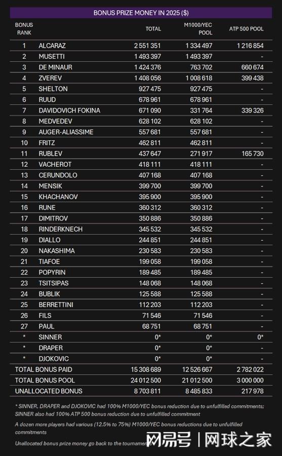 原本,阿尔卡拉斯因积分最高可获得480万美元的奖金,但他缺席了两站1000大师赛——加拿大公开赛和上海大师赛,结果他的奖金被削减了300万美元。这一削减使阿尔卡拉斯的赛季总收入降至1880万美元。如果他参加了更多大师赛,总收入本可以显著提高。相反,在大师赛奖金方面,穆塞蒂成为最大赢家。