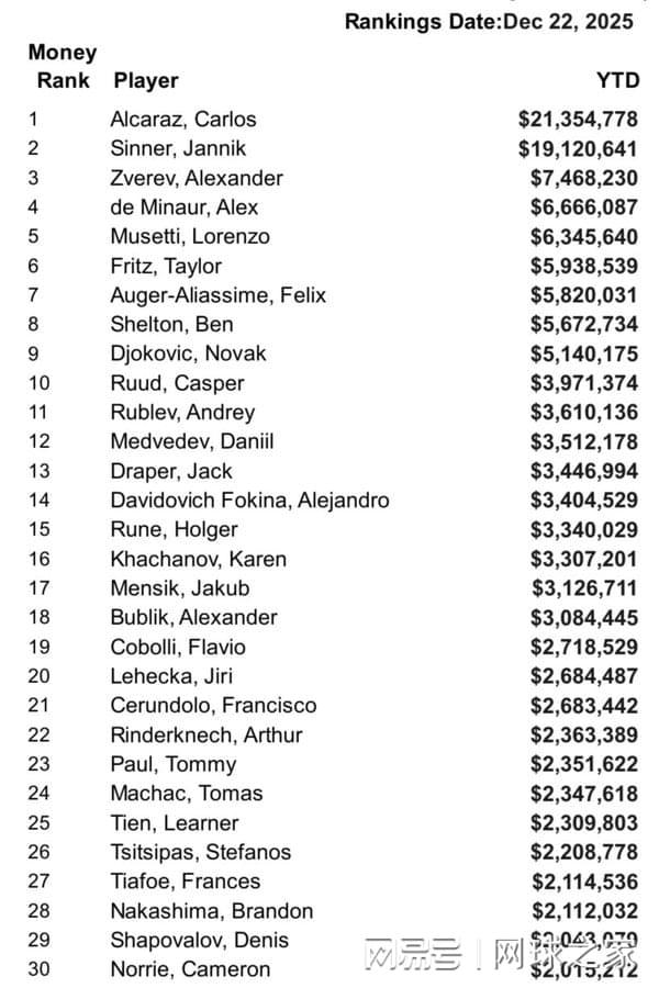 根据ATP的一份报告显示,阿尔卡拉斯在2025年共获得了21354778美元的比赛奖金,高居所有男子球员之首,这一收入也凸显了他本赛季的强大实力。