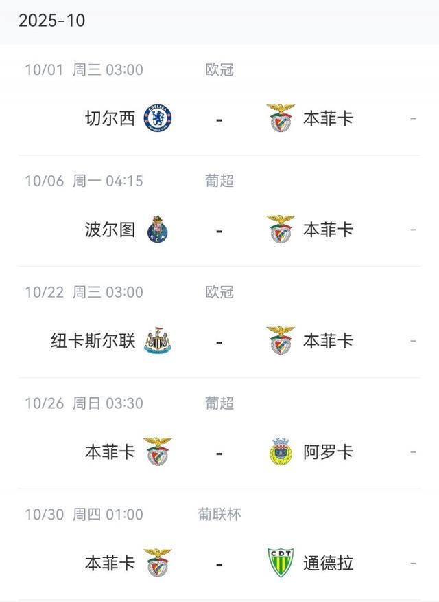 之后本菲卡在结束国际比赛日后,又将在欧冠客场挑战纽卡斯尔。