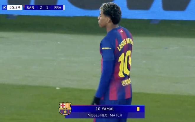 此役主场对阵法兰克福,首发出战的亚马尔在比赛第56分钟因犯规领到一张黄牌。