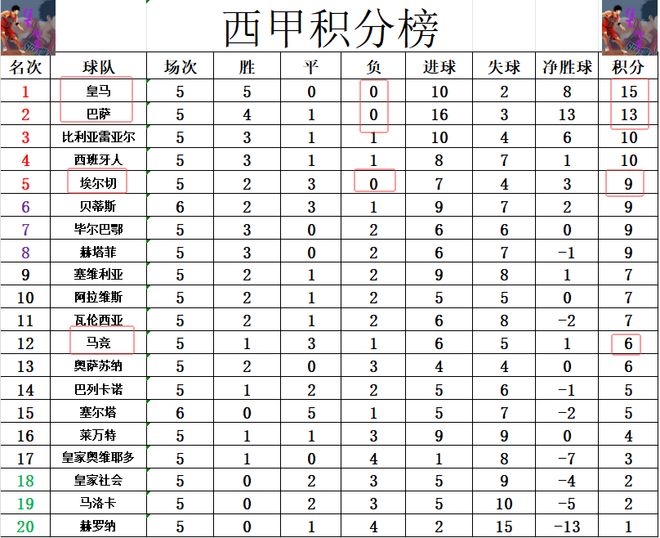 积分榜方面,巴萨大胜赫塔菲后4胜1平保持不败,2分之差继续紧追皇马位列第2。比利亚雷亚尔,西班牙人差巴萨3分分列3,4位。马竞新赛季表现很糟糕,今天又无力赢球,5轮只赢一场的他们排在第12,还不如升班马埃尔切给力,埃尔切2胜3平,是皇马和巴萨之外,仅剩的保持不败的球队,他们差西班牙人1分冲到第5的位置。