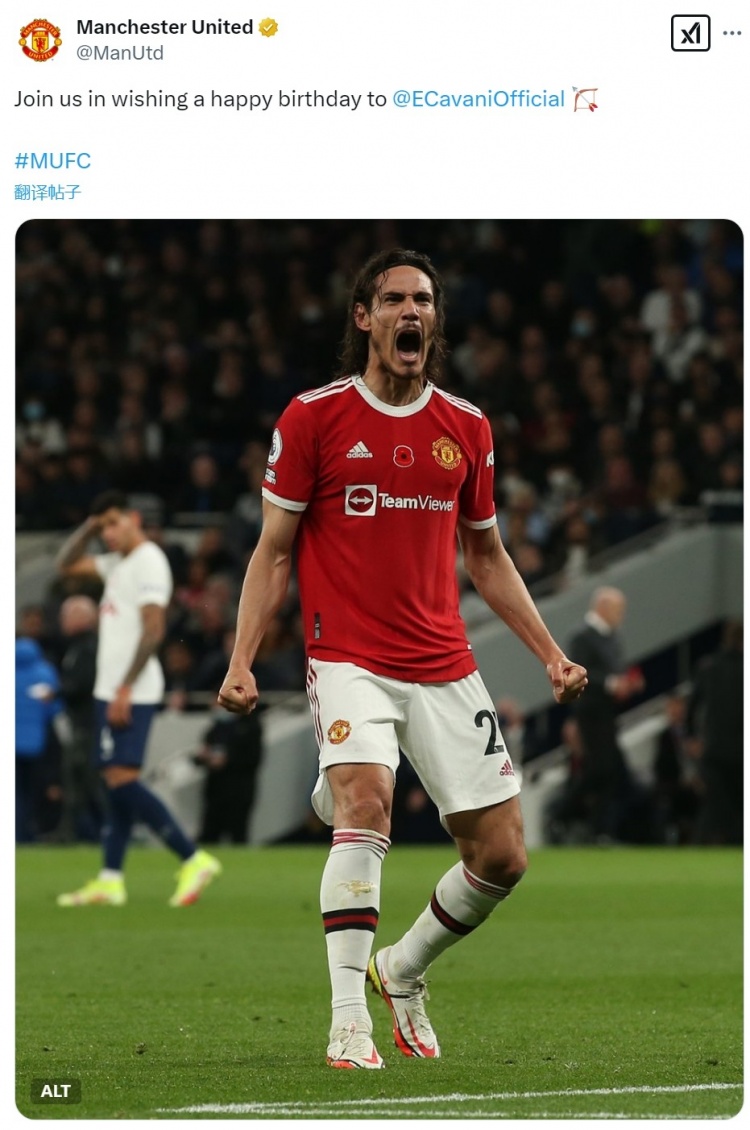曼联官方社媒晒出卡瓦尼效力球队时期的照片,配文:“与我们一起祝卡瓦尼生日快乐!”