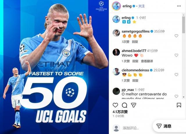 在社交媒体上,哈兰德晒出了自己最快达成欧冠50球的海报,显然这样的成就令曼城射手非常自豪。