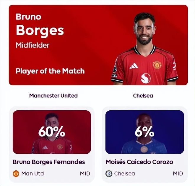 B费在赛后评选中获得60%的票数,以巨大优势当选全场最佳。很显然曼联队长的确起到了他个人价值作用,是俱乐部可胜蓝军主力功臣。此外,俱乐部大部分比赛人拿到了不错分数,看的出,这轮比赛他们打出了很好的表现。