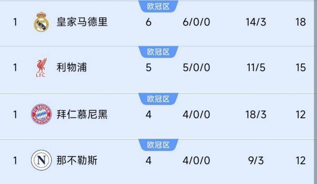 西甲方面皇马6连胜,英超利物浦5连胜,德甲拜仁和意甲那不勒斯都是4连胜。