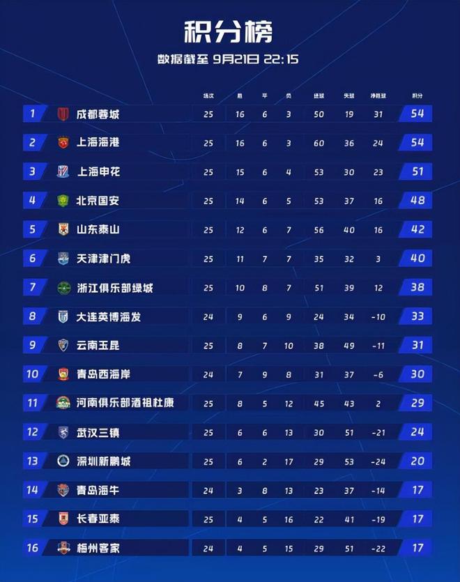 相比于前2个赛季,本赛季的中超争冠变得更为激烈,上海双雄、国安和蓉城全部加入了争冠行列当中;这4支球队也刚好位列积分榜前四。目前中超已经结束了第25轮的所有比赛,这一轮4支球队迎来轮番交锋;最终国安2:3不敌海港,蓉城1:1战平申花;积分榜上蓉城继续领跑,国安已经失去了主动权。