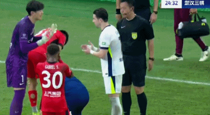 起身之后,李帅安慰了受伤倒地的邓涵文。颜骏凌则和绍尔争论李帅的动作是否属于犯规,后者做出蹬人的动作。