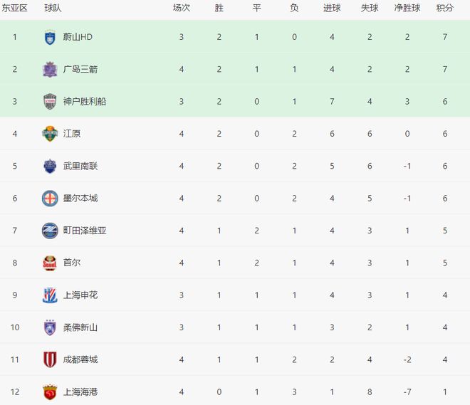 在亚冠东亚区的积分榜上,排名第1的是蔚山HD,2胜1平拿到7分。广岛三箭也是7分,排名第2。中超的3支球队都不在前8,处于淘汰区。上海申花只踢了3场,1胜1平1负,拿到4分,排名第9。成都蓉城踢了4场,1胜1平2负,拿到4分,排名第11,也就是倒数第2。上海海港最耻辱,1平3负,只拿到1分,排名垫底。中超的3支强队在亚冠赛场就是一个大笑话,战绩惨不忍睹,丢人现眼。
