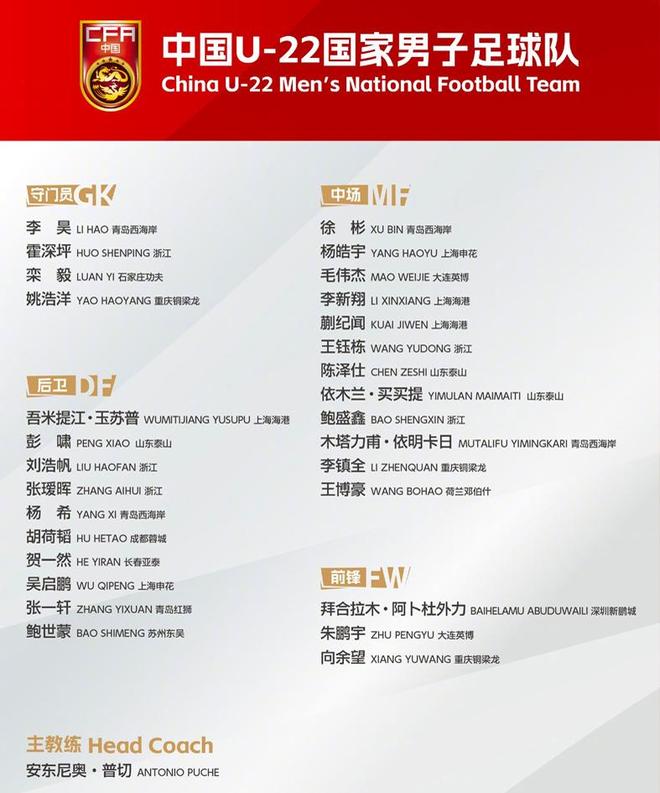 - 北京时间12月4日下午,中国足协公布U22国足12月集训及U23亚洲杯29人大名单,这份为备战明年U23亚洲杯敲定的阵容...发表于: 12-05 20:34